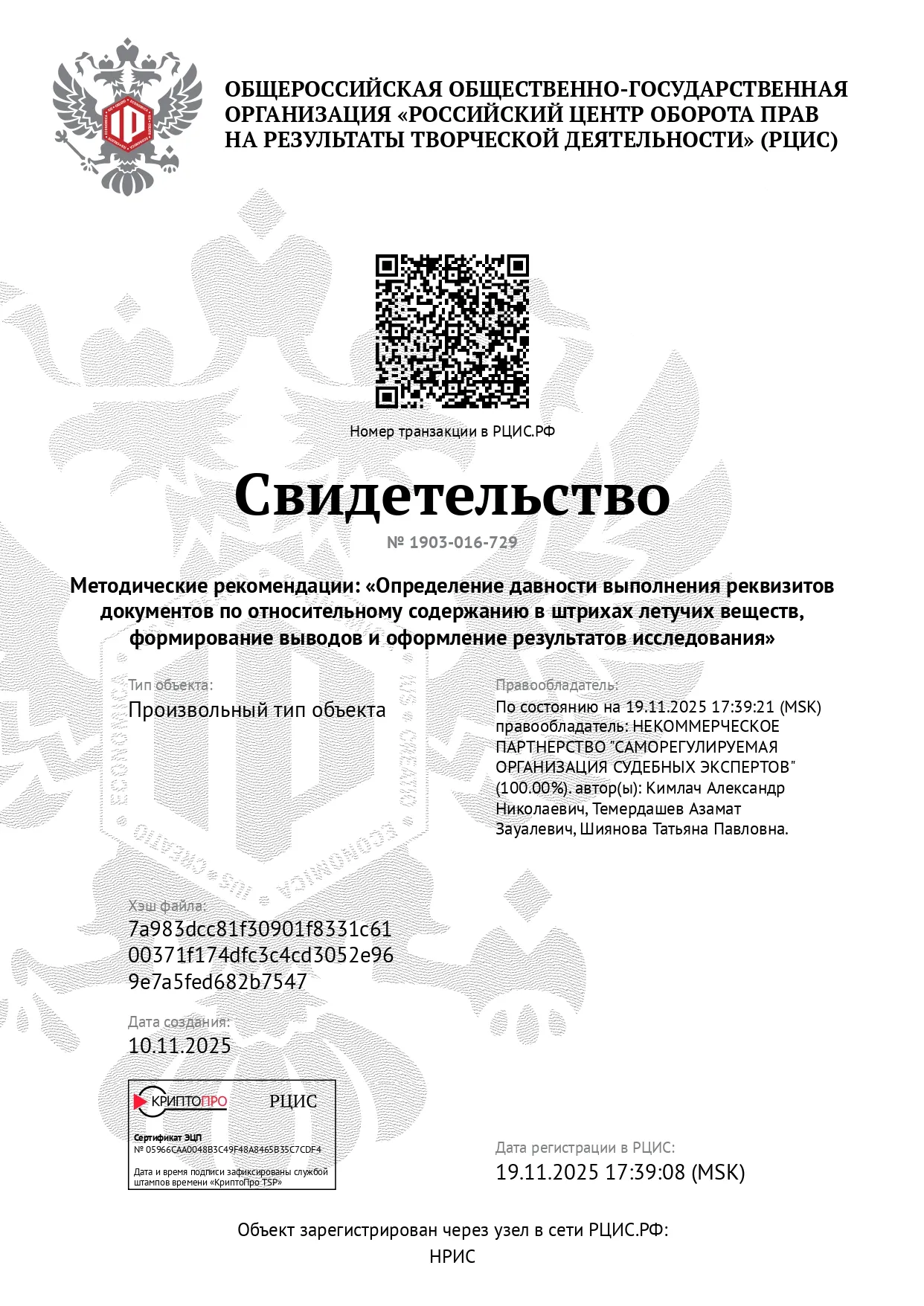 - Сертификат соответствия судебного эксперта № RU.Е1.21081601 по специальности 3.1 «Исследование реквизитов документов» в системе добровольной сертификации судебных экспертов, срок действия с 16.08.2024 до 15.08.2027;