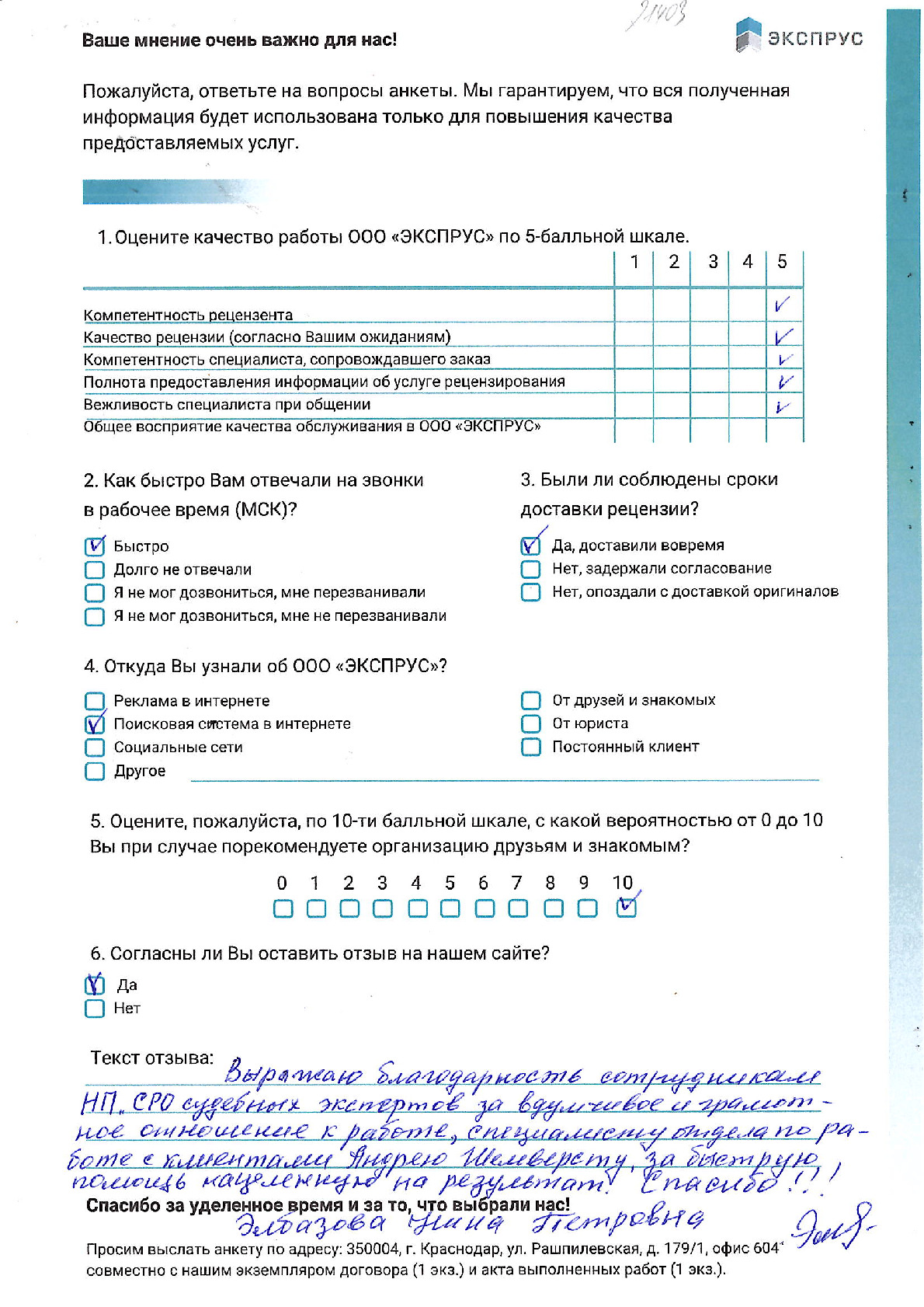 В этом разделе вы можете поделиться мнением о качестве нашей работы и предоставляемых услуг. Будем благодарны за любые комментарии, пожелания и предложения.