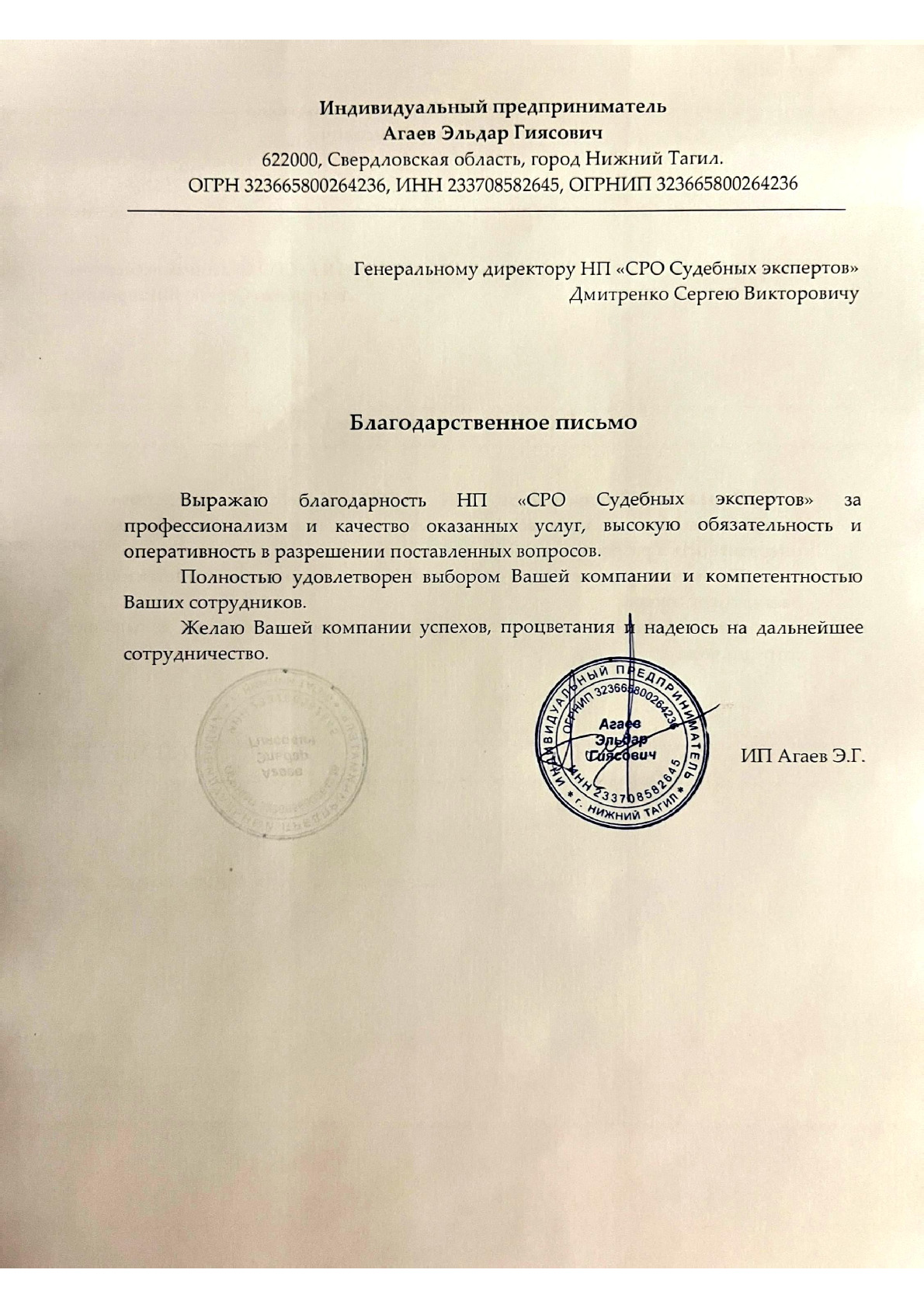 Выражаю благодарность НП " СРО судебных экспертов" за профессионализм и качество оказанных услуг, высокую обязательность и оперативность в разрешении поставленных вопросов. Полностью удовлетворены выбором Вашей компании и компетентностью Ваших сотрудников. Желаю Вашей компании успехов, процветания и надеюсь на дальнейшее сотрудничество.