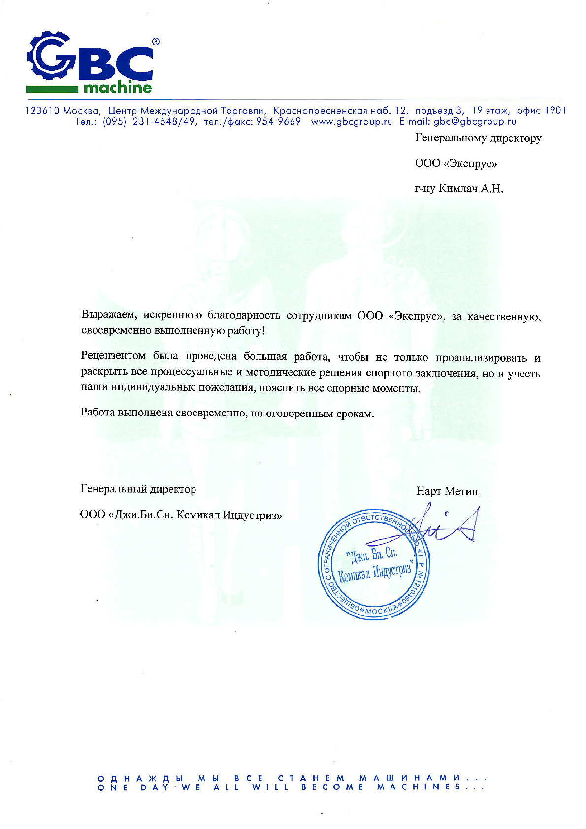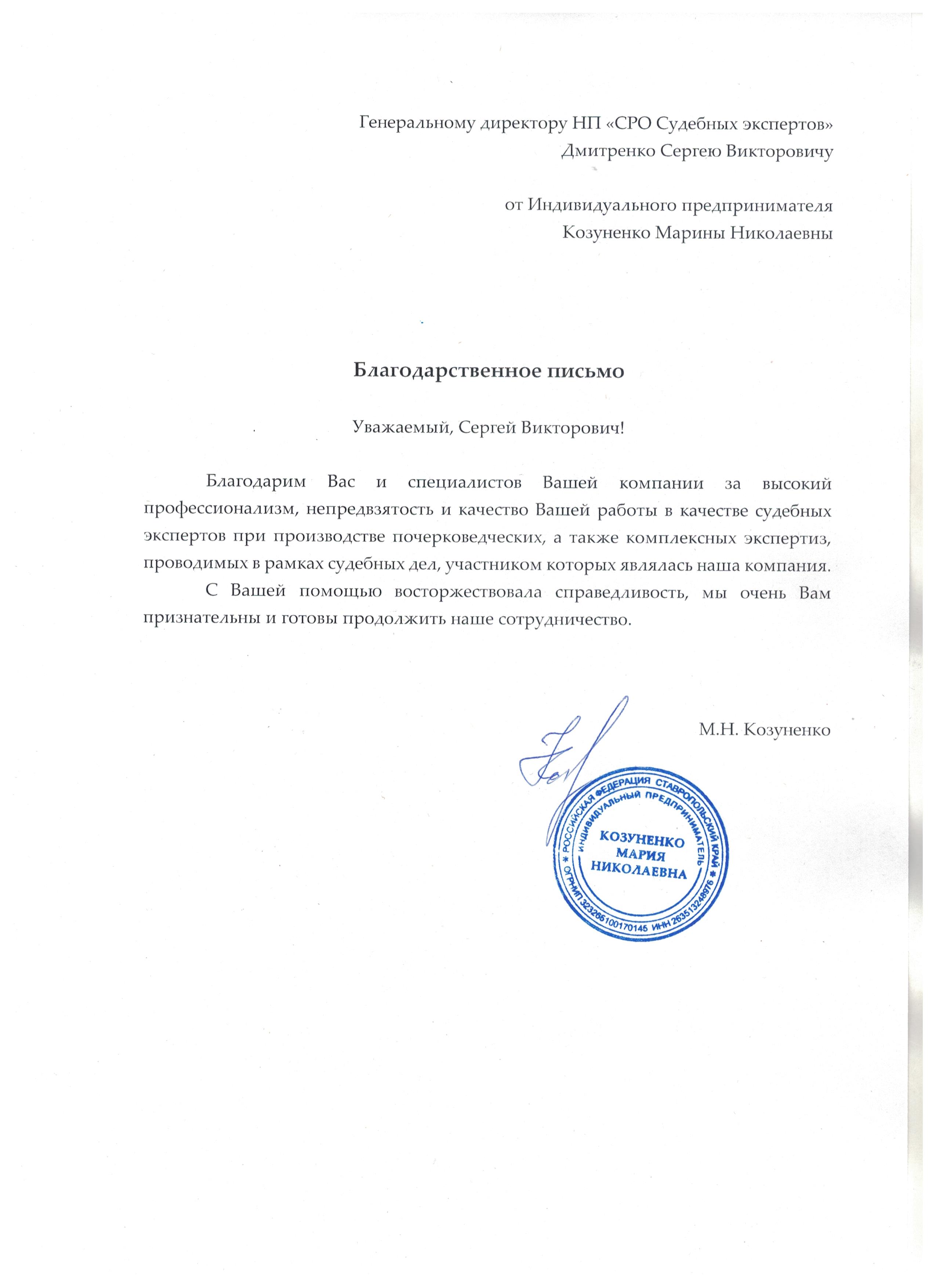 Уважаемый, Сергей Викторович! Благодарим Вас и специалистов Вашей компании за высокий профессионализм, непредвзятость и качество Вашей работы в качестве судебных экспертов при производстве почерковедческих, а так же комплексных экспертиз, проводимых в рамках судебных дел, участником которых являлась наша компания. С Вашей помощью восторжествовала справедливость, мы очень Вам признательны и готовы продолжить наше сотрудничество.