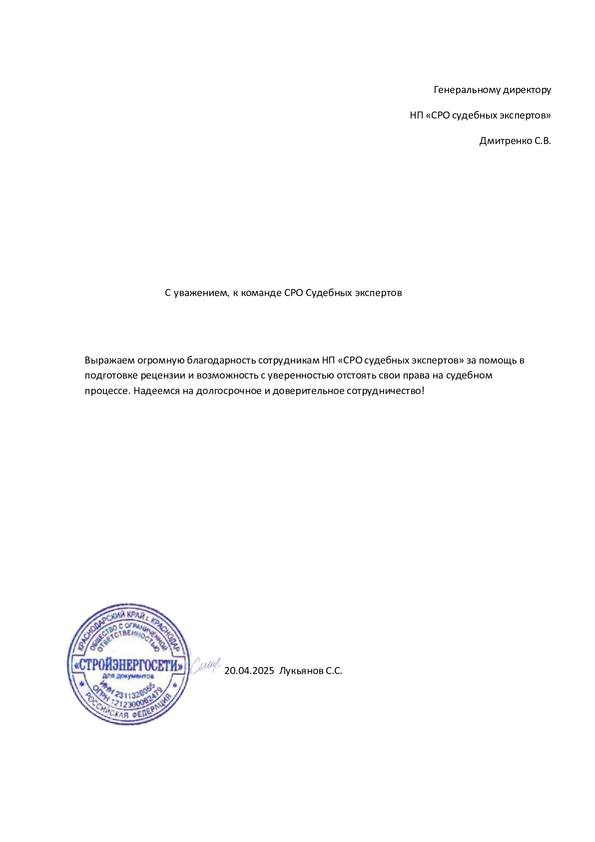 Выражаем искреннюю благодарность и глубокую признательность, лично Вам и всему коллективу НП «СРО Судебных экспертов» за длительное и плодотворное сотрудничество. Мы высоко ценим сложившиеся между нами деловые отношения и взаимопонимание. Хотим подчеркнутъ высокий уровень профессионализма Вашего персонала и поблагодарить за оперативность в решении вопросов. Желаем успешного развития и достижения новых вершин в бизнесе.